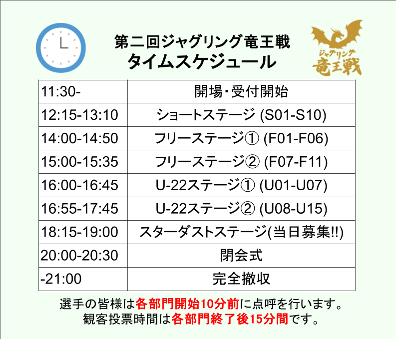 第二回 ジャグリング竜王戦 出場者一覧 競技ルール スポンサー アクセス お問い合わせ スケジュール 大会概要 大会名:第二回 ジャグリング竜王戦日程:2026 年 1 月 4 日 (日) 終日場所:大阪市立西成区民センター ホール※本大会はステージおよび舞台照明は使用せず、平土間での実施となります。観覧:無料(カンパ制) ジャグリング竜王戦とは? 「BlueHat」と「Nagotsuki Farm 」がタッグを組んでお届けするジャグリングの大会「ジャグリング竜王戦」 私たちは「ジャグリング竜王戦」を通じて、プレイヤーの活躍の場を創出すると同時に、コンペティションの持つエンターテイメントの力でジャグリング業界を盛り上げます。 各部門の優勝者には「竜王」の称号が与えられます。 競技ルール ■開催部門 U-22ステージショートステージフリーステージスターダストステージ ※追加開催 ■部門概要 U-22ステージ演技時間:5分以内 ※第一回から変更出場資格:22歳以下(2003年 4月 2日 以降に生まれた方)の選手のみ出場可ショートステージ演技時間:2分30秒以内出場資格:どなたでも出場可フリーステージ演技時間:6分以内出場資格:どなたでも出場可スターダストステージ演技時間:45秒以内出場資格:どなたでも出場可 ■演技時間についての詳細(U-22, ショート, フリー) 使用楽曲の制限時間は演技時間と同じとする。演技開始前の道具の配置等準備時間および演技終了後の片づけ時間は1分以内とする。最後の技、最後の礼、決めポーズ、ステージの退場、音楽の停止のいずれかを演技終了点とする。制限時間を大きく越えて演技を継続した場合、運営が強制終了のアナウンスをする場合がある。 ※第一回から変更 ■演技時間についての詳細(スターダスト) 使用楽曲は運営が用意する。演技開始前の道具の配置等準備時間および演技終了後の片づけ時間は1分以内とする。最後の礼、決めポーズ、ステージの退場、司会者のタイムアップの合図のいずれかを演技終了点とする。 ■順位決定方法および表彰(U-22, ショート, フリー) 全ての部門において、審査は観客投票によって実施する。 観客投票においては、所定のGoogleFormを使用する。 投票権は、その部門の全ての演技を観覧した観客のみに与えられる。 観客投票では、1位、2位、3位までをすべて選んで投票する。 1票につき、1位:4点、2位:2点、3位:1点とし、その合計点によって順位を決定する。 同点の場合、下記の優先順位で順位を決定する。①1位の得票数が多い者②2位の得票数が多い者③スタッフによる決選投票で多く得票した者 順位決定後、各部門の1位から3位までを表彰する。観客投票については、運営から明確な審査基準を設けたりすることはしない。演技を観た観客自身の価値観で「竜王に相応しい」と感じた演者に投票をするものとする(2025/11/14追記) ■順位決定方法および表彰(スターダスト) 順位は運営メンバー、もしくは運営が当日指名した審査員による協議によって決定する。順位決定後、1位の選手を表彰する。 ■演技についての諸注意 1. 以下のような演技を原則禁止とする。火や水、食べ物、動物等を使用した演技会場の床を著しく傷つけたり、汚したりするような演技公序良俗に反する演技観客、スタッフ、会場の安全を脅かすような演技その他、運営が不適切と判断した演技2. 原則として演技のやり直しは不可とする。※ただし、音響ミスなど出場者の責任でないエラーが起こった際は、演技のやり直しを要求することができる。 エントリー ■エントリー方法 スターダストステージのエントリーは当日に会場にて受け付ける。※U-22, ショート, フリーのエントリー受付は終了しました。 ■エントリー受付期間 2025 年 11 月 15 日 (土) 21:00~ 2025 年 12 月 7 日 (日) 23:59 U-22, ショート, フリー2025 年 11 月 15 日 (土) 21:00~ 2025 年 12 月 14 日 (日) 23:59スターダスト部門開始前まで ■出場費 U-22ステージ:4,500円ショートステージ:4,500円フリーステージ:5,500円スターダストステージ:無料(カンパ制) ■キャンセル規定 ご出場確定後にキャンセルをされた場合、出場費の返金は出来かねます。予めご了承ください。 ■応募者多数の場合の対応 エントリーは先着順で受け付け、定員に達した部門から随時エントリーを締め切らせていただきます。 出場者一覧 大会結果 大会終了後に公開 当日スケジュール ご協賛募集について 本大会では、大会の継続的・安定的運営のため、ご協賛およびカンパを募集しております。内容につきましては、以下の表よりご確認ください。 ■お申し込み方法(A,B,Cプラン) ※受付を終了しました。 ■お申し込み方法(カンパ) コチラからご購入下さい。 スポンサー様ご紹介 第二回 ジャグリング竜王戦は、多くの企業・団体様、ならびに個人の皆様のご支援を頂き、運営しております。この場をお借りし、心より御礼を申し上げます。 jugmap 様jugmapは竜王戦を応援しています。 https://jugmap.com/ ちきぽとれ 様ちきぽが運営する、肩肘張らない自由な写真撮影サービス。 「撮りたい時