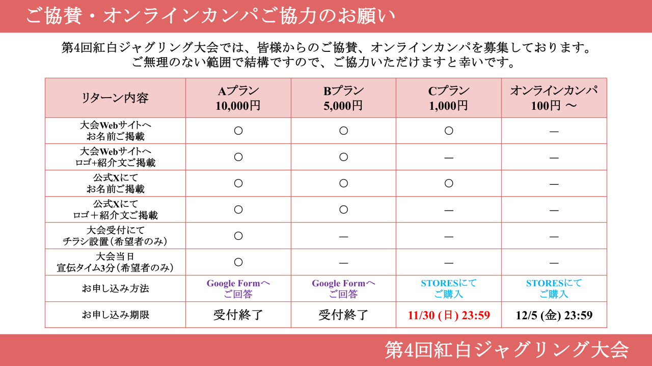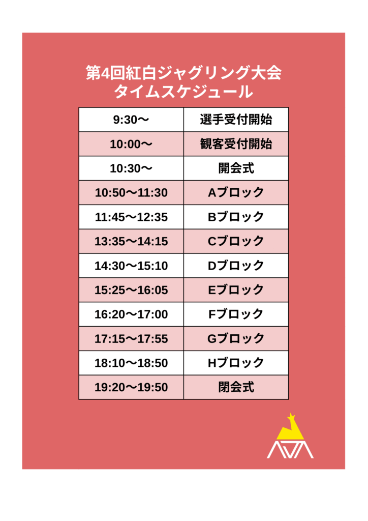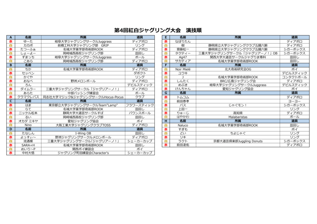 ◆ 大会概要 大会名 第4回紅白ジャグリング大会 日程2025年 12月 6日 (土) 会場愛知県名古屋市 名東文化小劇場 ホール ◆ 出場者一覧 ◆ 競技概要 競技概要はコチラから ◆ エントリー エントリーフォーム二次エントリーフォームはコチラ※キャンセル待ち:23組 (10/14 22:00時点) 一次エントリー期間 2025年 10月 5日 (日) 21:00 ~10月 10日 (金) 23:59 ※先着順、定員に達し次第終了。 ※定員に達したため、一次エントリーの受付は終了しました。 一次エントリー対象者愛知県内在住の学生愛知県内の学校に在籍中の学生チームの場合、1人でも上記の条件を満たしており、かつチーム全員が学生である場合に限り、この枠にエントリー可能となります。 二次エントリー期間 2025年 10月 12日 (日) 21:00 ~10月 17日 (金) 23:59 ※先着順、定員に達した後はキャンセル待ちとなります。 二次エントリー対象者どなたでも 注意事項フォームへのご回答後に回答のコピーがGoogle Formsより自動返信されます。自動返信が届かない場合は、迷惑メールボックス等をご確認の上、運営メールアドレスまでご連絡ください。運営メールアドレスaichijugglingassociation★gmail.com(★をアットマークに変更してください)出場受付は”運営メールアドレスからの受付完了メール”をもってお知らせいたします。フォームに回答した段階では出場は確定しておりません。ご理解のほど、よろしくお願いいたします。 ◆ スケジュール ◆ ご協賛・カンパ 本大会では、大会の継続的・安定的運営のため、ご協賛およびオンラインカンパを募集しております。内容につきましては、以下の表よりご確認ください。 A,Bプラン※募集は終了しました。沢山のご支援、誠にありがとうございます。 Cプラン, オンラインカンパコチラから該当のプランをご購入ください。 ◆ ご協賛スポンサー様 全日本皿回し協会 様皿回しはとっても楽しいです!!回すだけならすぐにできるし、より深く考えると、特性の違う道具、皿と棒から構成されていて研究のし甲斐があります!全日本皿回し協会と皿回しをよろしくお願いします! 浜松スポーツジャグリングサークルじゃぐなぎ 様静岡県浜松市で活動しているジャグリングサークルです。 来年2月21日(土)には恒例の「じゃぐなぎ杯」を開催予定です。エントリー、観戦などでぜひお越しください。 jugmap 様jugmapは紅白ジャグリング大会を応援しています。【毎日に、ジャグリングを。毎日を、ジャグリングと。】https://jugmap.com/ おいもらて 様この協賛は、名城大学薬学部奇術部ROOK現役生「おいも」と「らて」の提供でお送りします。よっしゃ(学生にしては)大金投げるぜ!私達のカンパくらえくださいませ運営様👊💥毎年素敵な大会をありがとうございます” Kaju Burger豊田店 様千鳥の相席食堂にも出演した国際大会チャンピオン(ディアボロ)が作るハンバーガー店です。 ちきぽとれ 様ちきぽが運営する、肩肘張らない自由な写真撮影サービス。 「撮りたい時に、撮りたい人を」をモットーに、人物写真を気軽に撮影します。 個人でのご支援を頂いた皆様 河原優 様オンラインカンパ 3名様(11/25 22:30時点) ◆ アクセス 会場愛知県名古屋市 名東文化小劇場 名古屋市名東区上社一丁目802番地上社ターミナルビル3階地下鉄東山線「上社」下車 1番出口すぐ市バス「上社」下車すぐ ◆ 運営 運営スタッフ けんちゃん(代表) 伊藤康晃(副代表) オカダミキヤ しぇりー 城取希 トゥー なすび ますだまいこ めいこ ◆ お問い合わせ もしご質問等ございましたら、こちらのメールアドレスへご連絡ください。愛知ジャグリング協会メールアドレスaichijugglingassociation★gmail.com(★をアットマークに変更してください)また、X(旧Twitter)にて最新情報を発信しております。愛知ジャグリング協会公式X※本大会に関して、会場への直接の問い合わせはご遠慮ください。